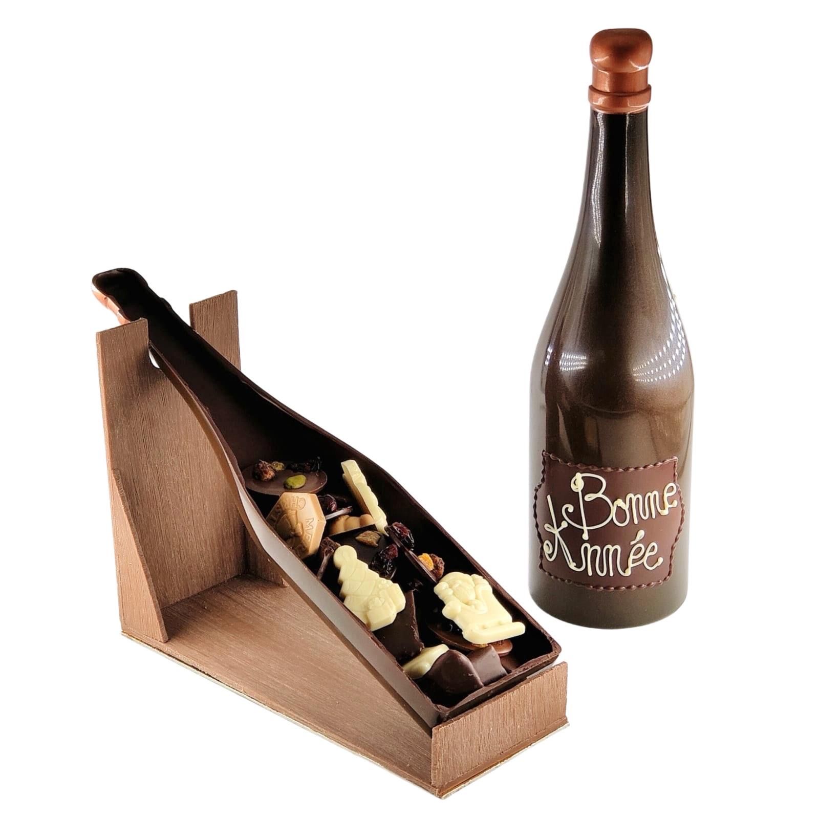 Cette Bouteille taille réelle en chocolat noir est delicatement posée sur un socle chocolat lait effet bois, pour décorer votre table de la nouvelle année. Garnie à 550g de gourmandies.