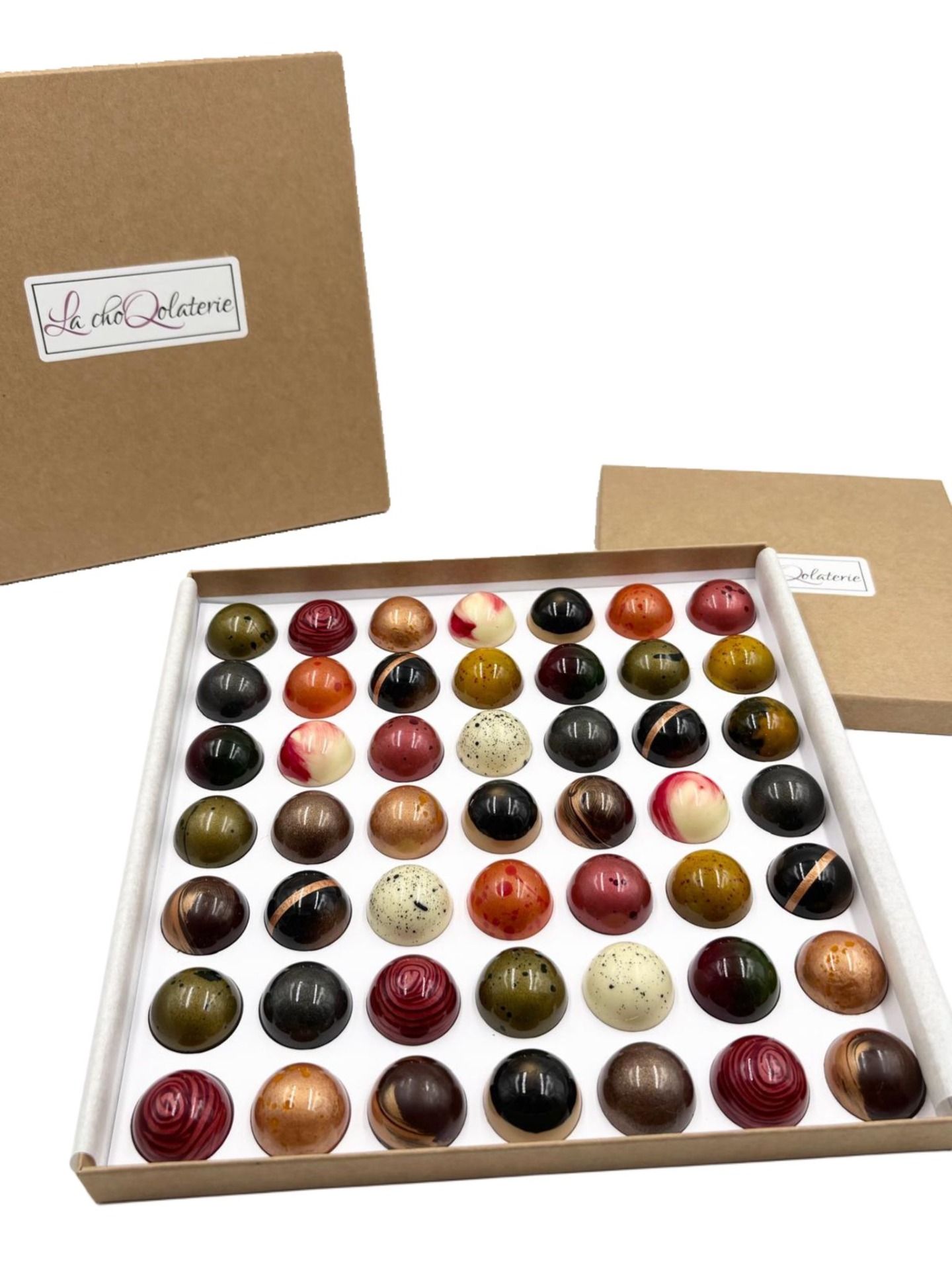 Framboise Hibiscus : Crème UHT 35%, sucre cristal, pulpe de framboise, beurre laitier, glucose, trimoline, beurre de cacao, colorant rouge (E122), colorant scintillant (E172), enrobage : chocolat noir 68% minimum (pâte de cacao, sucre de canne, beurre de cacao).