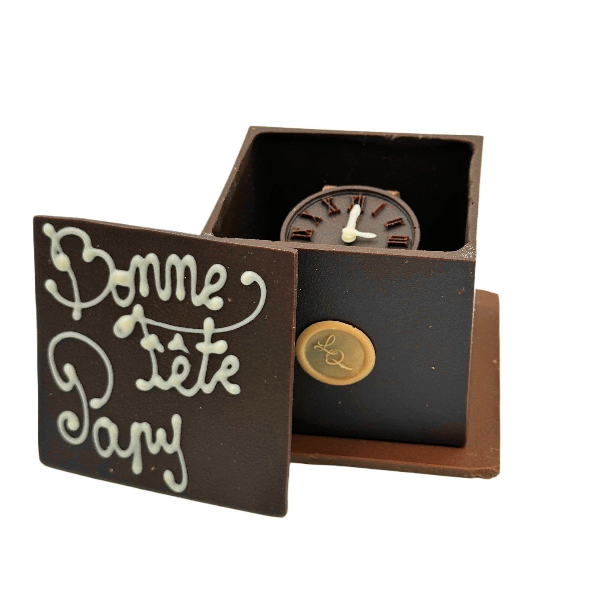 Boîte en chocolat praliné noisette, contenant une jolie montre pour plaire aux papys